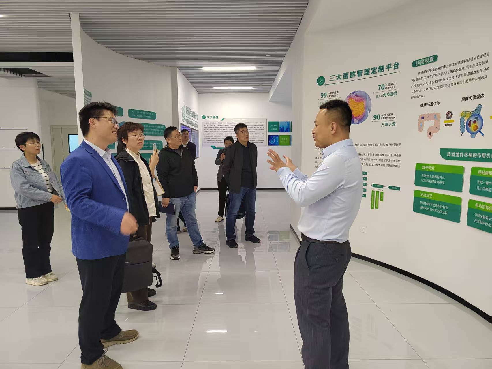 在丽山健康集团副总经理、丽山细胞医学发展有限公司董事长房路陪同下,考察团实地走访了聚焦高端麻醉药剂及围术期用药的安必达医药集团,山东细胞治疗领域的领军企业丽山生物,专注于肠道菌群与人体健康研究的菌健生命科学以及专业从事医药安全性评价的山东欣博医药集团有限公司。深入了解企业在细胞制备工艺优化、肠道微生物组学创新、药物生物安全性评价等方面的最新进展,就技术攻关难点和潜在合作方向进行初步沟通。